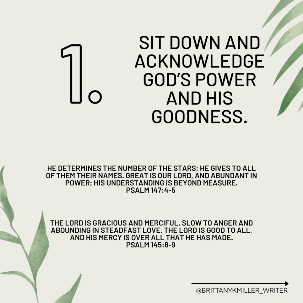 - Sit down and acknowledge God’s power and His goodness.