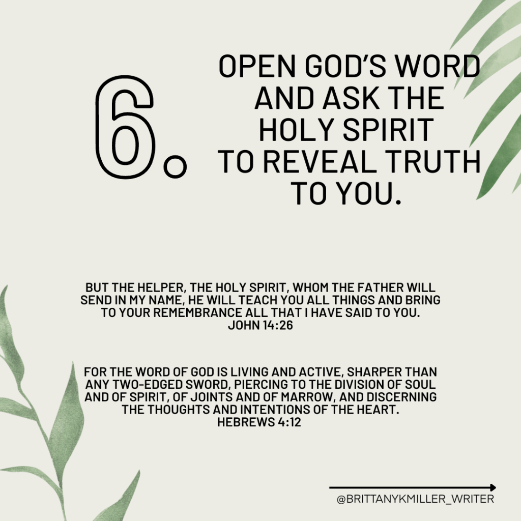 - Open God’s Word and ask the Holy Spirit to reveal truth to you.