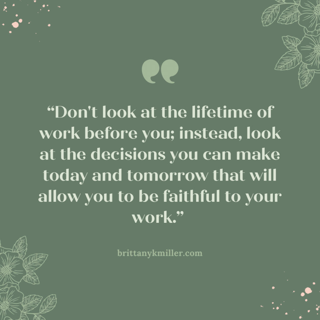 Choose just the first small step in the right direction. Don’t look at the lifetime of work before you; instead, look at the decisions you can make today and tomorrow that will allow you to be faithful to your work.