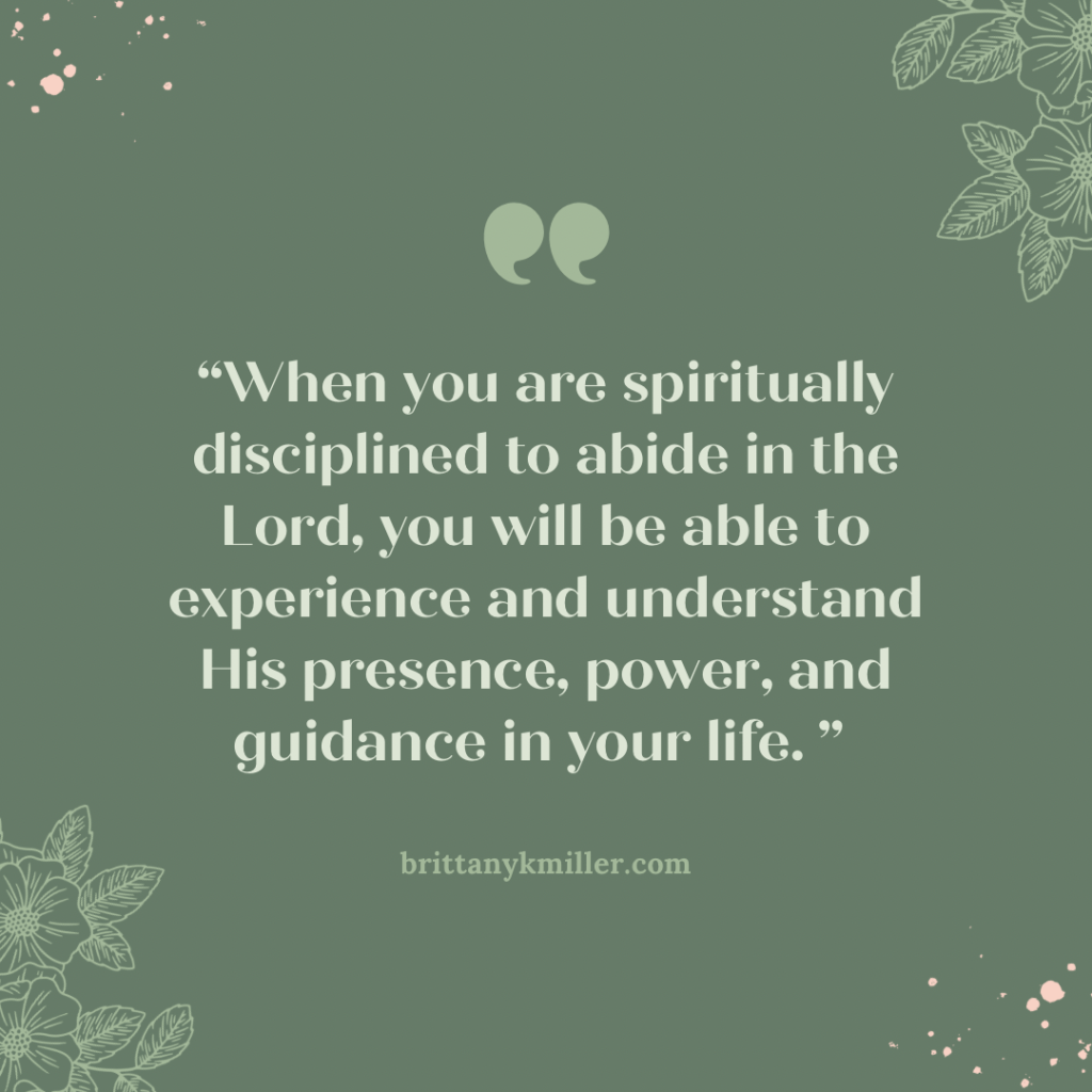 When you are spiritually disciplined to abide in the Lord, you will be able to experience and understand His presence, power, and guidance in your life. You will be able to discern the circumstances you are facing. You can trust and obey Him amid whatever you are facing. You’ll be able to make a decision consistent with God’s word. You’ll be able to love the people around you well. You’ll be able to work hard. You’ll be able to rest.